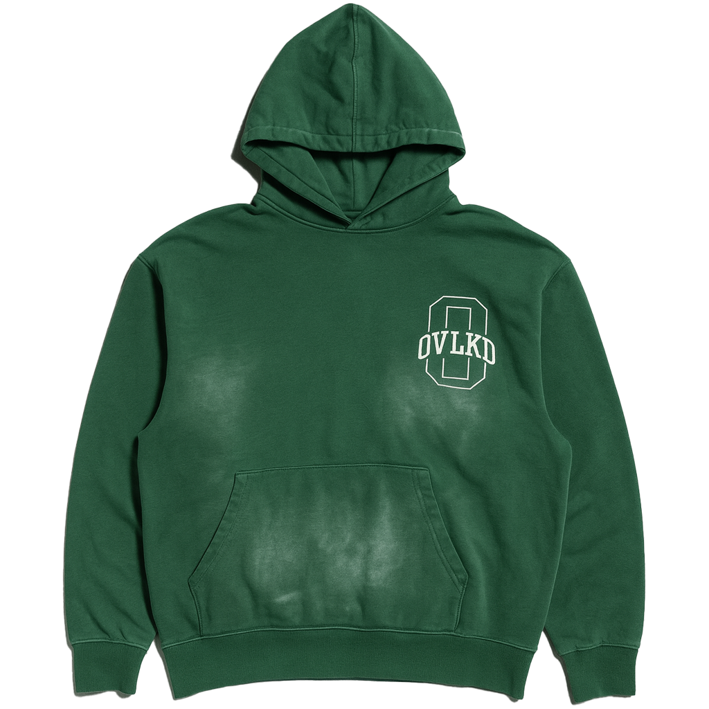 A vintage sun-faded pull-over hoodie. Embroidered OVLKD Varsity logo on the front and distressed lettering and embroidery across the back. Boxy and cropped fit.