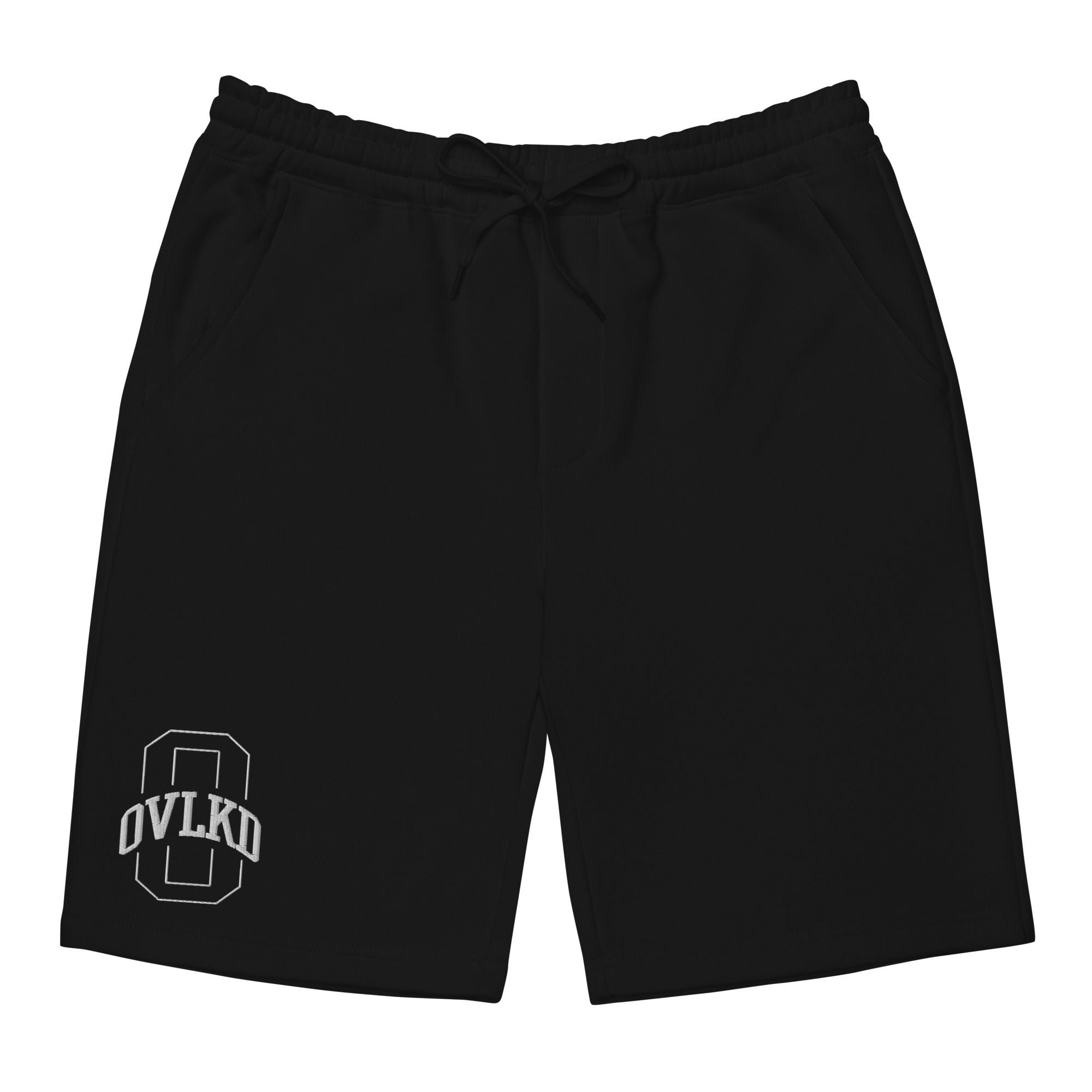 OVLKD Athletics fleece shorts deliver soft, everyday comfort with an athletic fit, featuring an embroidered OVLKD logo, elastic waistband with shoestring drawcord, two jersey-lined pockets, and a back pocket.